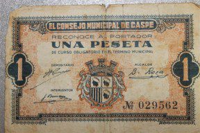 Durante la Guerra Civil, numerosos ayuntamientos de la zona leal a la República, ante la escasez de moneda, se vieron obligados a emitir sus propios billetes. El caso se repitió en varios consistorios del Bajo Aragón. La «peseta caspolina» es la mejor conocida de esta terna de billetes locales que, según creemos, se emitieron únicamente […]