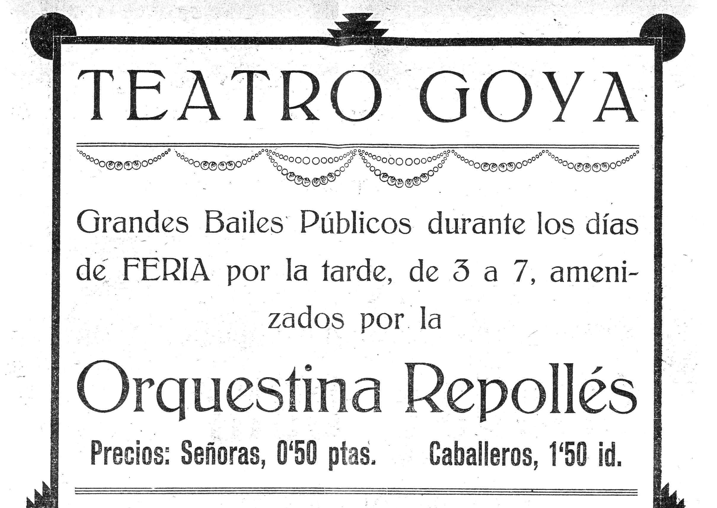 Ciertamente, el público tampoco pagaba por escuchar a los de Repollés lo que realmente valían: en los “grandes bailes” celebrados en noviembre de 1932 en el Teatro Goya, con diversión garantizada de 3 a 7 de la tarde, las entradas de caballero costaban peseta y media, y las de las señoras cincuenta céntimos, según se anunció entonces en hojas volanderas.