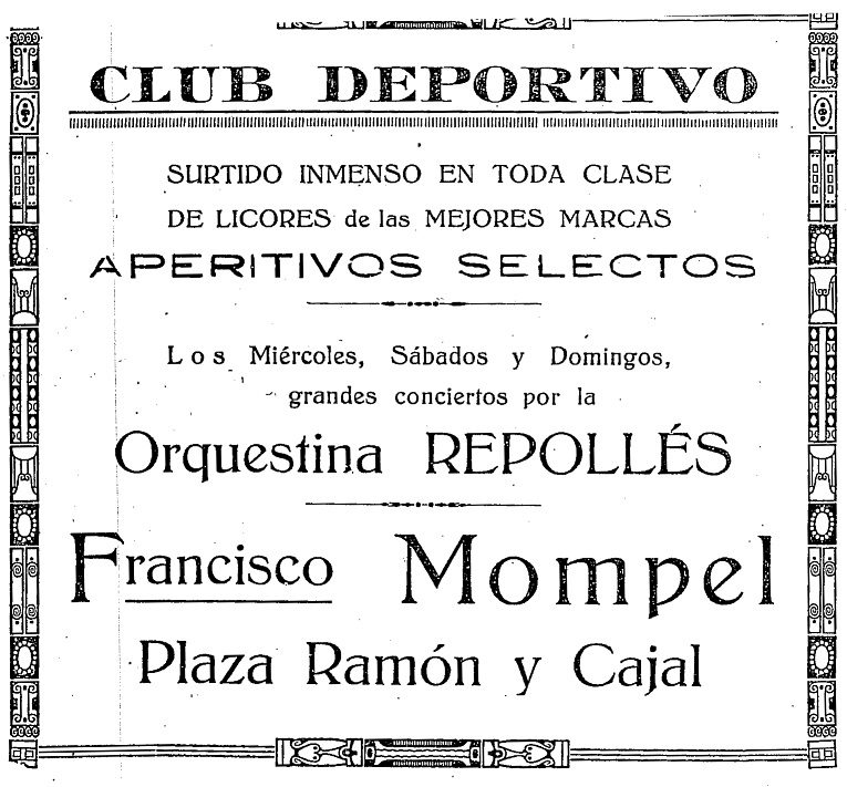 [8] Mompel anuncia los bailes de la Orquestina en el programa oficial de fiestas de 1928. El Guadalope (Caspe), 9.6.1929, inserta este suelto: “El dueño del acreditado bar del Club Deportivo nos anuncia que en breve darán principio los conciertos de verano, amenizados por la muy aplaudida Orquestina Repollés. El servicio de café, aperitivos y helados estará espléndidamente servido, por lo que no cabe duda de que la amplia plaza de Ramón y Cajal ha de verse todas las noches concurrida”.