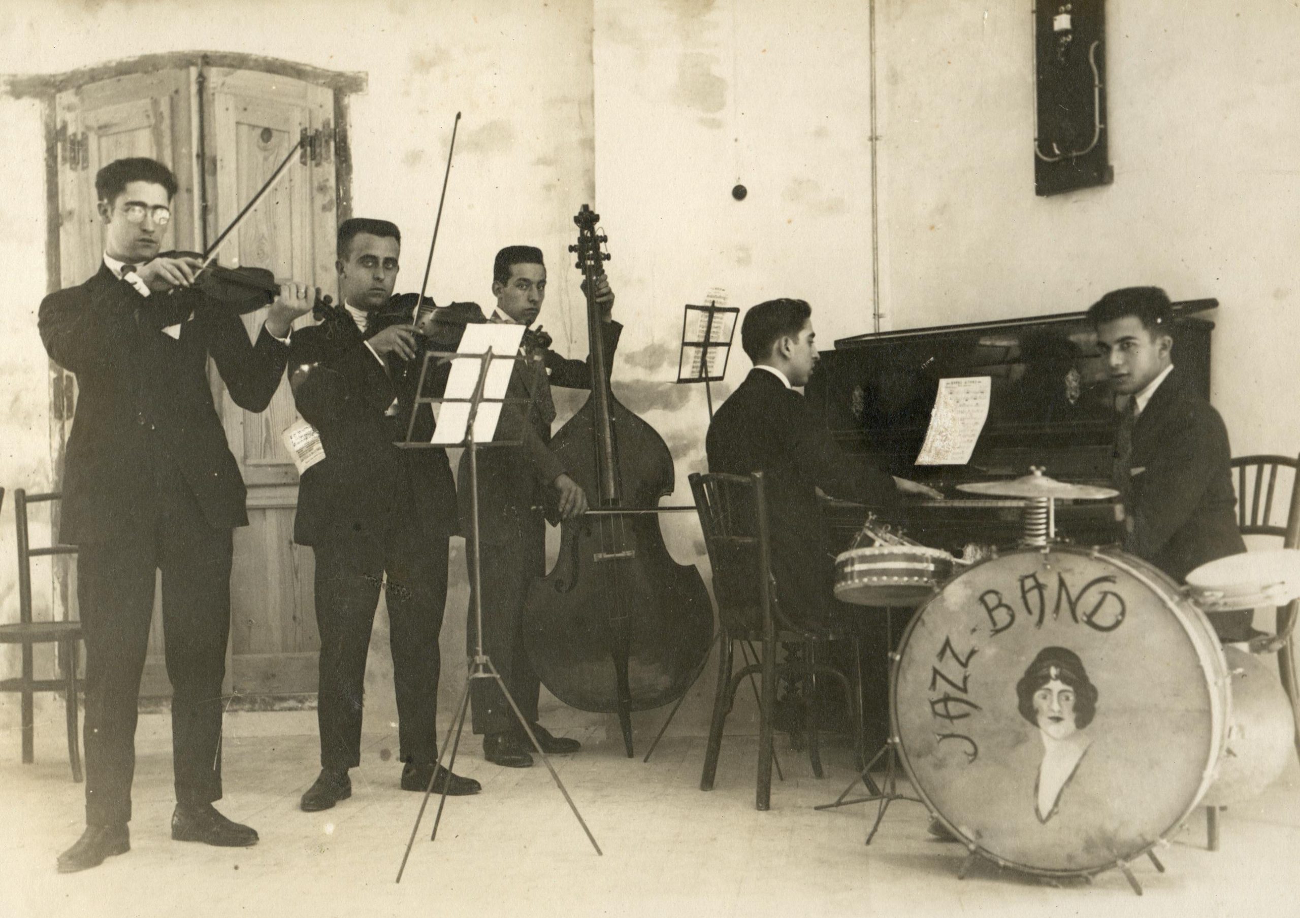[5]La Jazz-Band de Repollés ya animó una fiesta organizada por el Club Deportivo Caspe en la primavera de 1924 (de la que da cuenta El Día, del 9 de abril, dato que agradezco a Iván Barberán). Integraron esta formación germinal, además del director, Genaro Arbonés Fontané (batería), Emilio Catalán Centellas, Agustín Luna Serrano (violín) y José Tobeñas Hueso. En el zaragozano Foto Studio de la calle Méndez Núñez, encargaron algunas copias (¿también el disparo?) de una instantánea en la que posan como para imagen de un cartel.