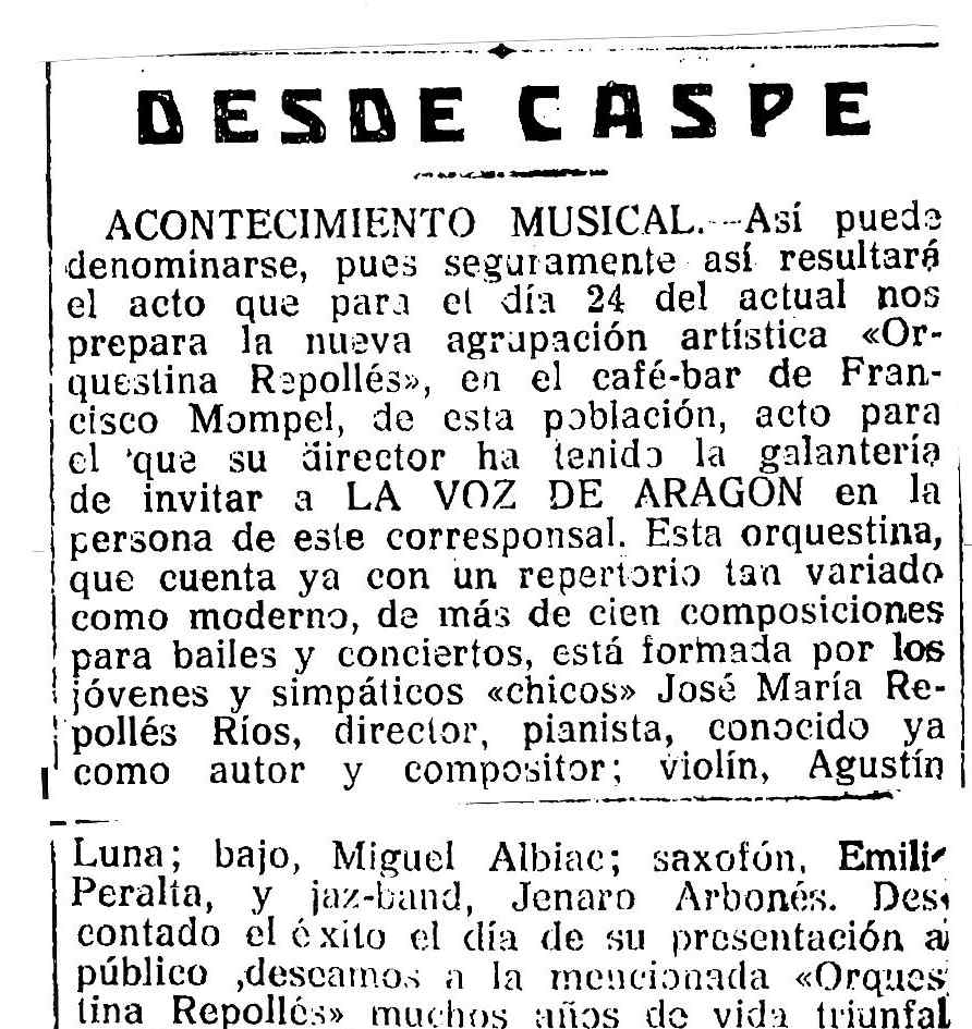 “Es un hecho ya la constitución de la orquestina local de bailes modernos que dirige el conocido y joven maestro José María Repollés; amablemente invitados hemos tenido el gusto de escuchar estos días algunos de los ensayos, saliendo muy complacidos de la interpretación de su extenso repertorio y pronosticando para la nueva entidad musical muchos triunfos si siguen con el interés y entusiasmo que han empezado, ya que arrestos y condiciones artísticas no les faltan para triunfar. (…) Hora es de que Caspe cuente con una orquesta de esta clase para en todo momento darnos a conocer las composiciones más selectas del repertorio moderno”.[4]