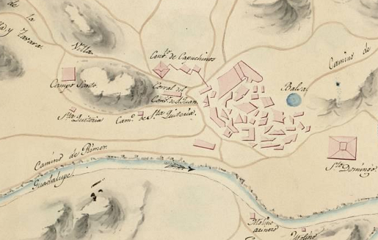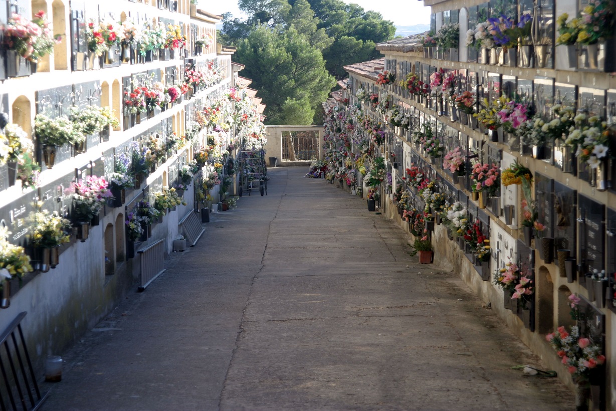 Desde tiempos medievales, el cementerio ‘antiguo’ de Caspe ocupó ambos lados de la Colegiata. La parte derecha (mirando de frente el monumento) para las sepulturas de adultos y la izquierda con un espacio reservado para los niños; todo ello sin olvidar que en el interior del templo abundaban también los ‘vasos’ o sepulturas comunes, de presbíteros y de familias de donantes. Pero aquello se hizo insostenible. En 1788 Ramón Aparicio, prior curado, escribe al arzobispo y le expone sin tapujos: “Hay gravísima necesidad de erigirse de nuevo uno espacioso, y decente, en la forma que lo tiene dispuesto y mandado Ntro. Católico Monarca”.[1]