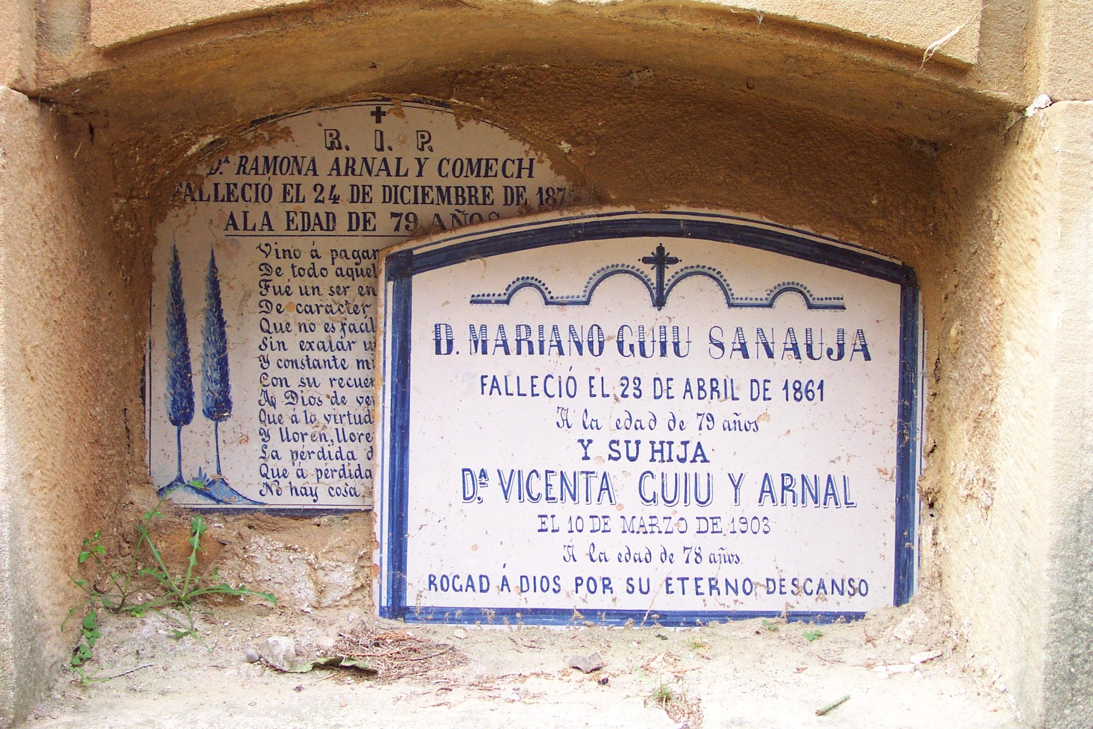 Un caso singular constituye la placa cerámica de Ramona Arnal y Comech, fallecida a los 79 años la Nochebuena de un año de la década de 1870; se trata de una ‘lápida’ adornada con el dibujo de dos cipreses y un poema epitafio de 14 versos, texto que se conservaba en perfecto estado en 2001, pero imposible de leer cuando lo vi por impedirlo un obstáculo apoyado en el nicho.