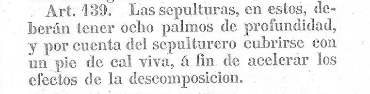 Por supuesto, también se cavaron enterramientos: “Las sepulturas, en estos, deberán tener ocho palmos de profundidad y por cuenta del sepulturero cubrirse con un pie de cal viva, a fin de acelerar los efectos de la descomposición” (artículo 139 de las Ordenanzas Municipales de 1852).[7]