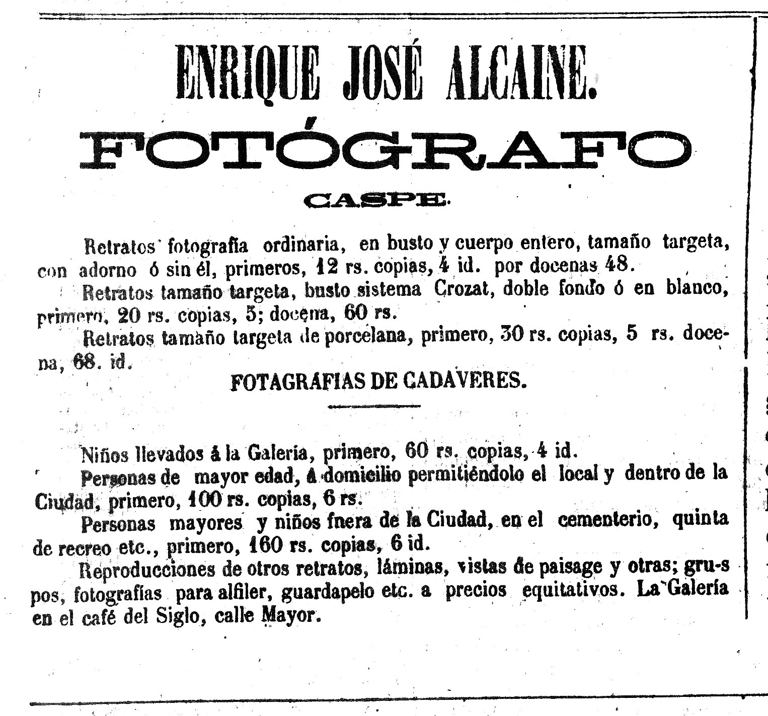 En 1868 el fotógrafo José Enrique Alcaine y Mínguez, instalado en Caspe, publicita en la prensa su disposición a recibir encargos para retratar cadáveres, se supone que a domicilio, según los cánones de una práctica que se popularizó en la España de aquel tiempo y que garantizaba al cliente un recuerdo de su ser querido.[1]