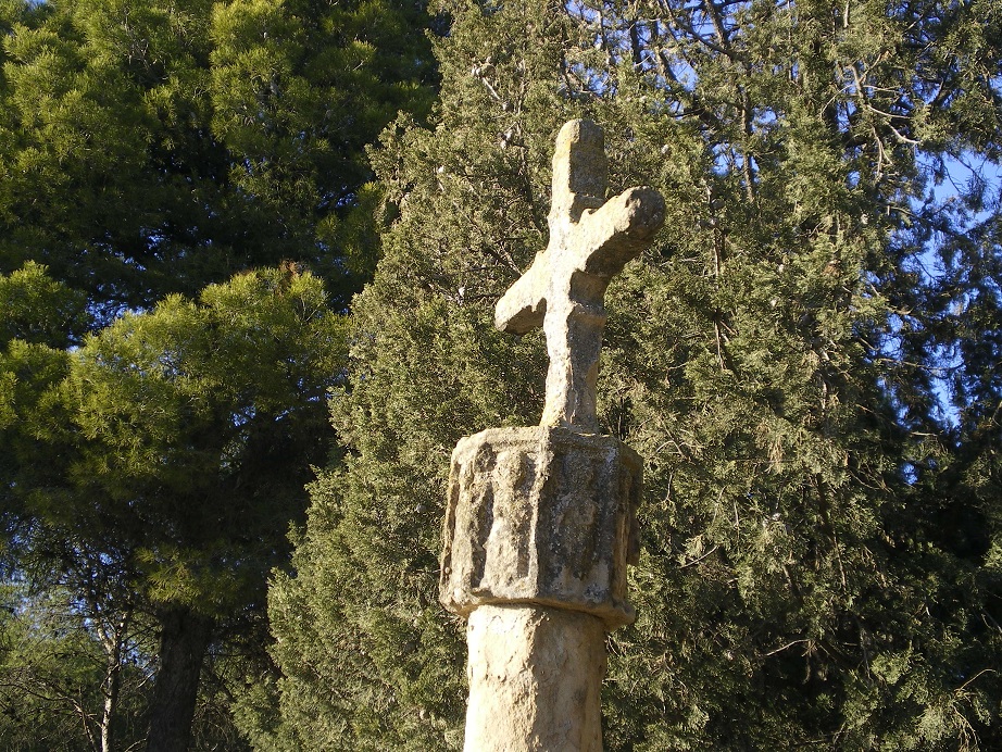 La cruz pétrea encolumnada que –tras conocer varias reubicaciones– hoy se mantiene en pie en la arboleda que da acceso al cementerio, procede de un puente sobre el Guadalope que una riada destruyó en el siglo XIX. En 1863 el Ayuntamiento decidió su inicial traslado al entorno del camposanto, aunque parece ser que no se ejecutó el acuerdo hasta 1872, año en el que el alcalde encarga el trabajo al maestro de obras Francisco Albareda. El caso es que, de no actuar urgentemente, está llamada a desaparecer. La parte aparentemente más antigua, el tambor con una serie de figuras o apostolado sobre el mástil, se descompone a ojos vista.[10]