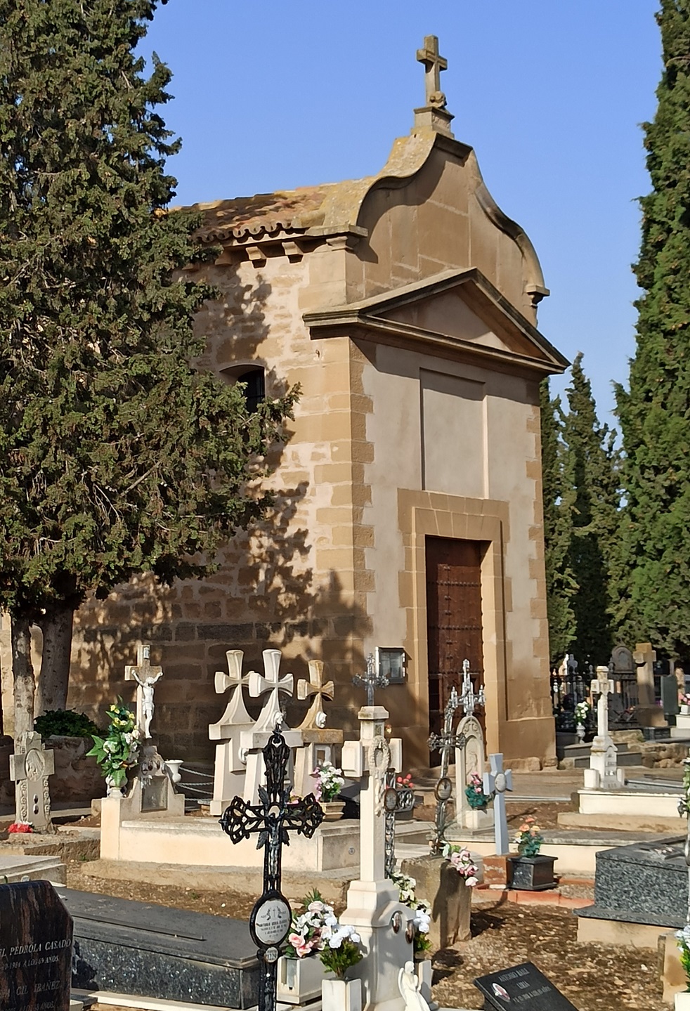 ¿Cómo se decoró el interior de esa capilla? Se ha señalado que, cuando entró en servicio el cementerio del Cazcarro, se abandonó, poco a poco, el lugar de los antiguos enterramientos junto a la iglesia parroquial. Había allí una ermita dedicada a San José de origen ignoto que acabó siendo derruida. Pero señalan las crónicas que todos los objetos de culto que se guardaban en ella, además del retablo, fueron trasladados al nuevo emplazamiento del camposanto y acomodados en el interior de la capilla levantada en 1877. Si tenemos por cierto que su puerta permaneció cerrada en los años de la última guerra civil y que el interior no sufrió ningún tipo de daño, estaríamos hablando, con toda probabilidad de que el retablo que hoy contemplamos -sencillo, pero antiguo- sigue siendo el procedente de la derruida ermita de San José.
