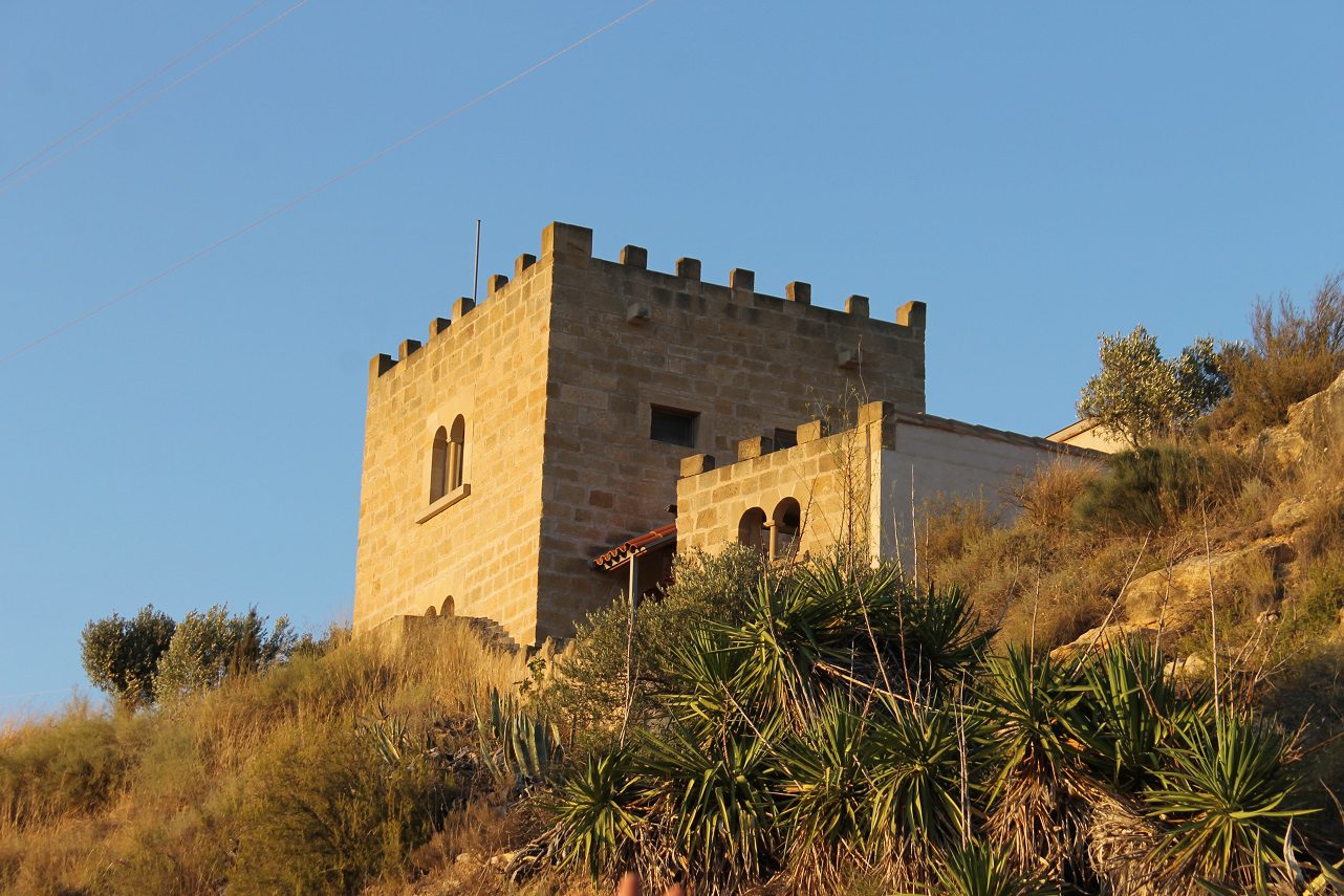 Torre neomedieval sobre el promontorio al otro lado del camino