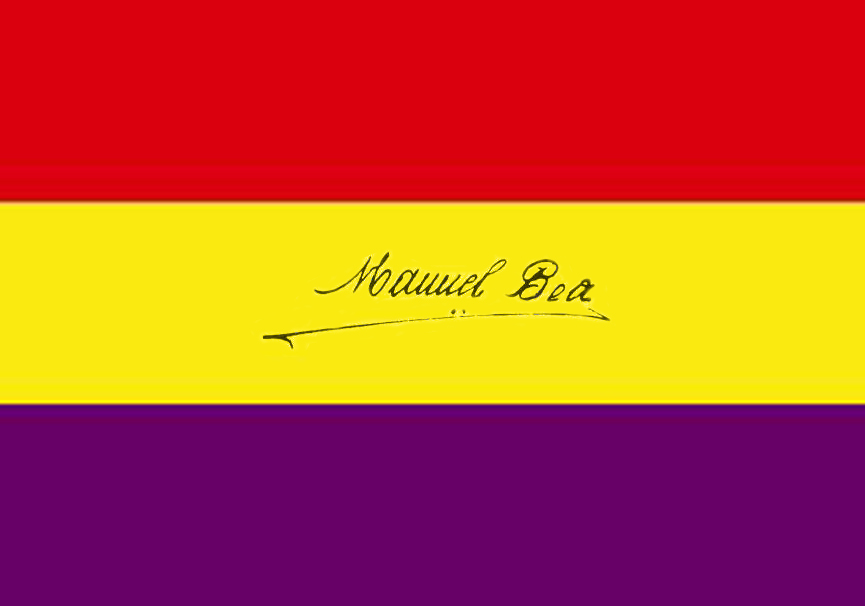 Montaje realizado con la firma original de Manuel Bea (procedente de los libros de actas del Ayuntamiento de Caspe) sobre la bandera republicana
