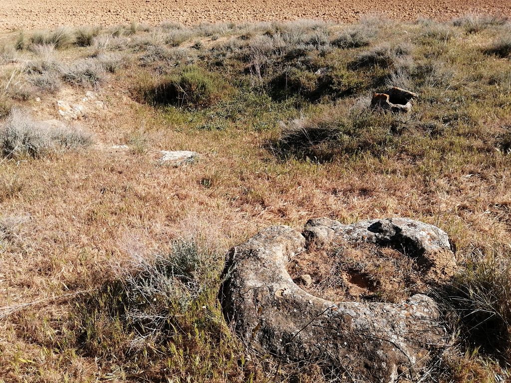 9. Balsete de Valdelacruz. Tras dejar atrás la zona de la iglesieta nos adentramos, girando hacia el Norte, en Valdelacruz, un barranco bien chulo que une los términos de Caspe y Sástago. Junto al camino se hallan las ruinas de esta balsa, muy deteriorada por la propia escorrentía del cabezo. Bajo ella ha sido dispuesto un rudimentario bebedero para aves.