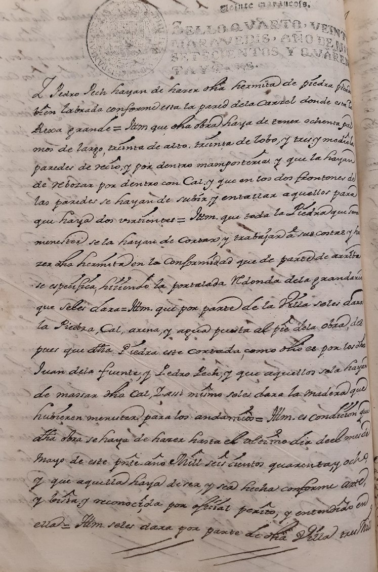 Se conocen más detalles de este pacto, al que hemos tenido acceso. Las dimensiones del proyecto se ajustaron a “ochenta palmos de largo, treinta de alto y treinta de lado, y tres y medio las paredes de recio” (si el palmo de entonces equivale a 19,25 cm: 15,4 m de largo x 5,7 m de ancho x 5,7 m de alto, con un grosor de los muros de algo más de 67 cm).[3] Se prevé un interior de mampostería revocado con cal, tejado a dos vertientes, “hiciendo la portalada redonda de la grandaria que se les dará” (o sea, con arco y de envergadura apropiada al edificio).[4]