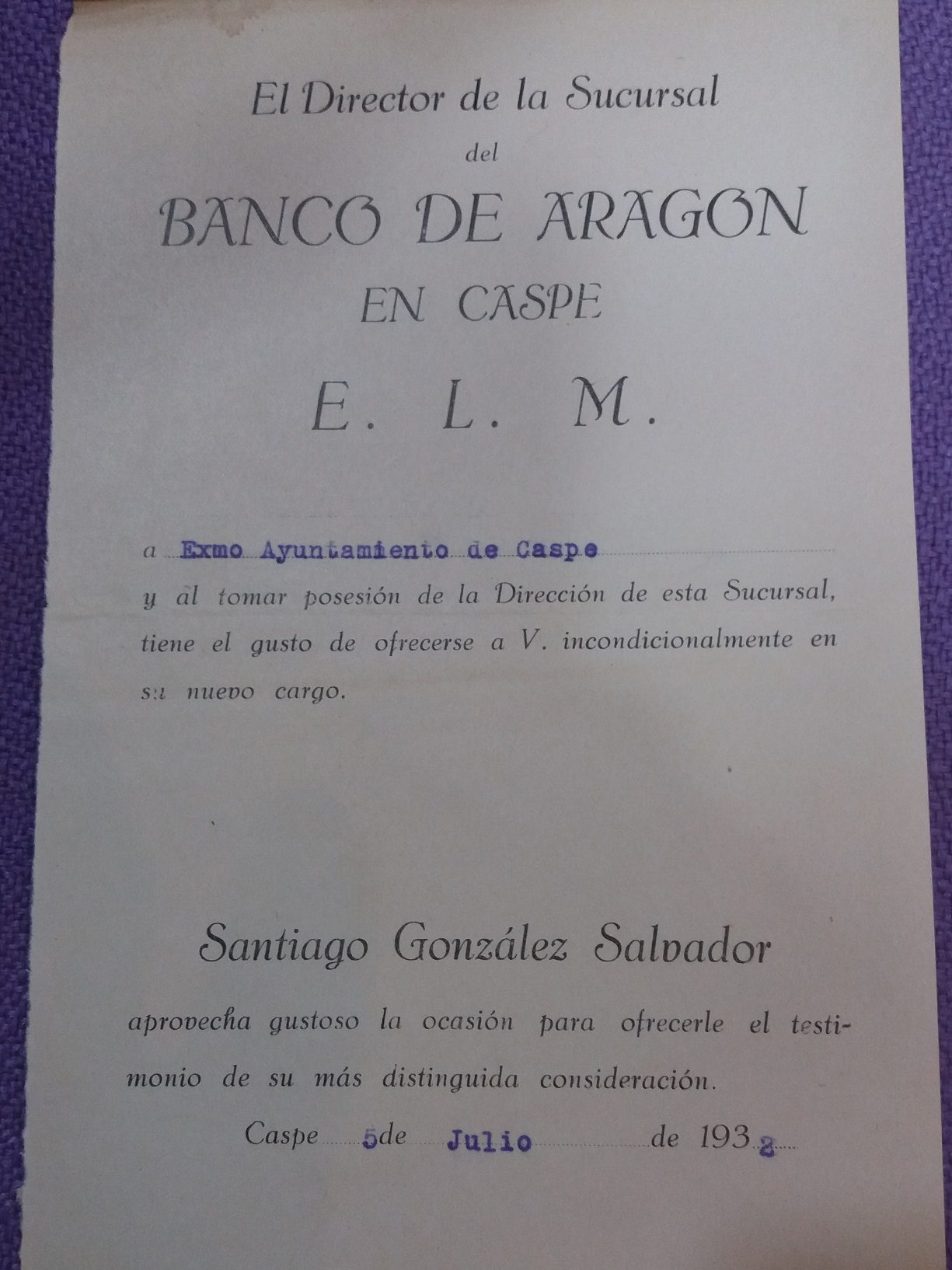 Gracias a la localización en el Archivo Municipal de este documento, nos trasladamos al momento preciso del nombramiento del nuevo director del Banco de Aragón de Caspe. Corría julio del año 1932 cuando Santiago González Salvador estrenaba cargo. Por entonces, González era ya conocido por ser uno de los progresistas más destacados de la ciudad. Poco antes de la guerra pasaría a militar en el Partido Comunista. Durante la misma ocupó puestos de responsabilidad, llegando a ser designado Delegado General de Abastecimientos y Transportes del Consejo de Aragón. Con la caída del frente de Aragón partió hacia el exilio, pero la Causa General franquista seguía recordándole: