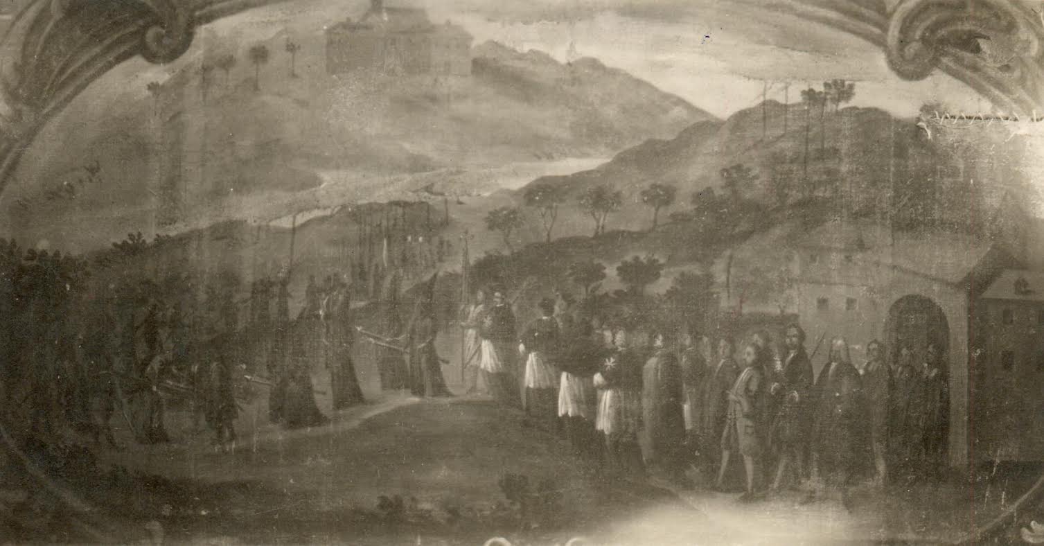 Fotografía de Antonio Gascón (principios del siglo XX) al lienzo del siglo XVIII que representaba una rogativa o romería al Santuario de Santa María Magdalena. Archivo gráfico ABC-ASD