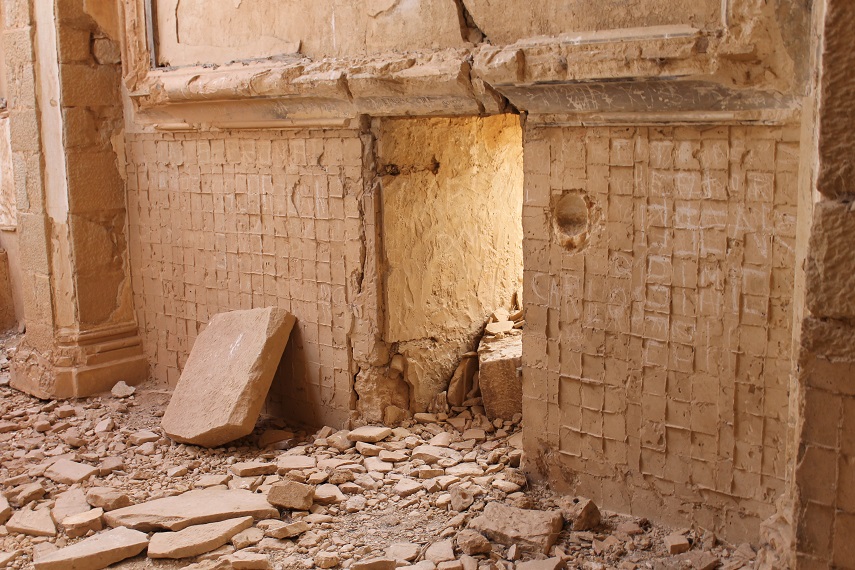 Estado del atrio de la iglesia fotografiado desde el interior . Al fondo, una de las estancias hundidas